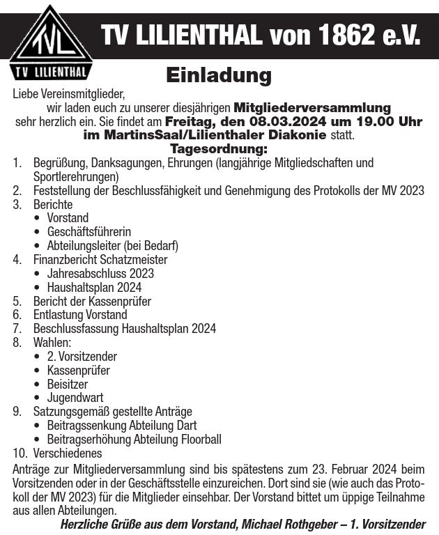 31. Januar 2024 Mitgliederversammlung – 08.03.2024 Der TV Lilienthal von 1862 e.V. lädt alle Vereinsmitglieder zur ordentlichen Mitgliederversammlung am Freitag, den 08.03.2024 um 19.00 Uhr in den MartinsSaal der Lilienthaler Diakonie ein.