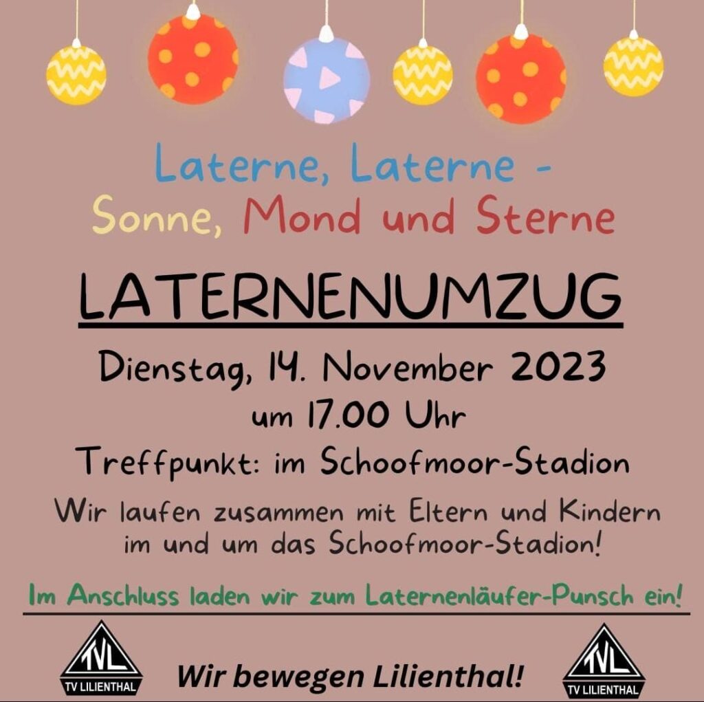 Alle Kinder sowie Eltern, Verwandte, Großeltern und Freunde sind ganz herzlich zu unserem Laternenumzug am Dienstag, 14. November eingeladen. Gemeinsam erleuchten wir ca. für eine Stunde die Wege in und um das Schoofmoor-Stadion und singen die altbekannten Lieder. Die Lilienthaler Kinder- und Jugendfeuerwehr wird uns dabei wieder begleiten. Im Anschluss an die Laternenabschlussrunde im Schoofmoor-Stadion laden wir zum heißen Punsch ein.